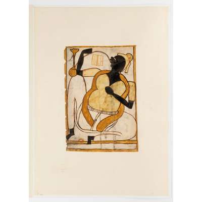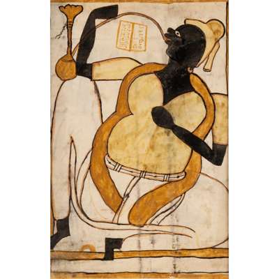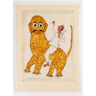 Lots 106 to 110 were collected by the Archers between 1942 and 1946. They are scroll paintings by the Jadupatua caste of Santal Parganas, the largest tribe of Eastern India. Mildred writes, ‘These scrolls were not intended for sale but rather to equip the artist for a second important function – that of a wandering minstrel.’ The jadupatua would wander from one village to another, gather an audience and slowly unwind their scroll to illustrate their somewhat amateurish constructions of their legends. The scrolls illustrate subjects including the life of Krishna among the cowherds (Lots 108, 109), Death’s kingdom showing the tortures of the damned (Lot 106) and a god who rules tigers, amongst others. Bill and Mildred were so enchanted by these scrolls that they divided them into panels for exhibition. Many examples were exhibited by the Arts Council of Great Britain throughout the country between 1967 and 1969.