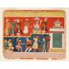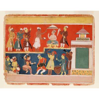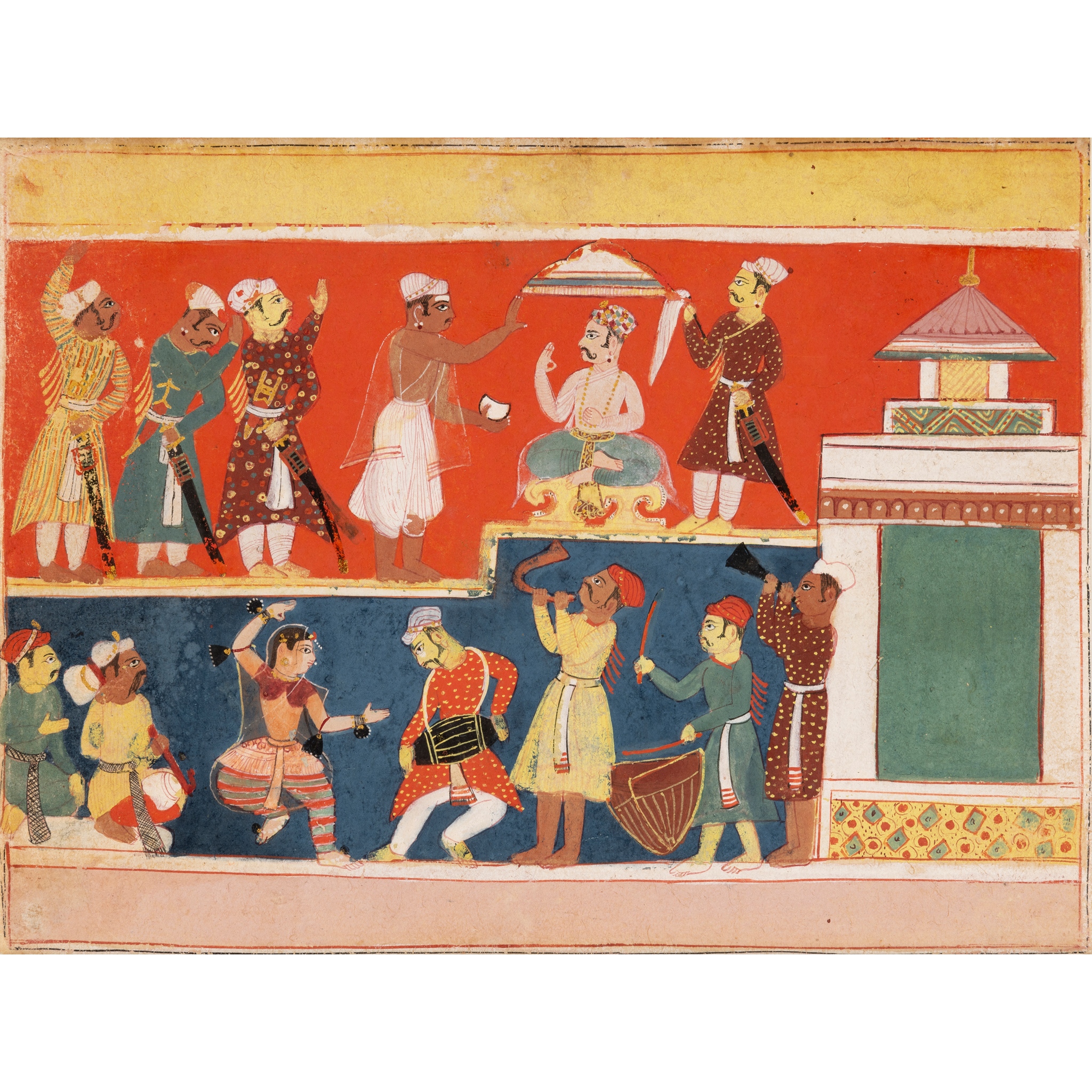 gouache heighted in gold on paper, with two registers, above depicting Dasaratha, ruler of Ayodhya and father of Rama, seated under an umbrella, a priest is shown smearing his forehead amongst a line of worshippers against a red ground, the lower register depicts a dancing girl accompanied by musicians against a blue ground, mounted, framed and glazed [mp1]