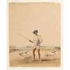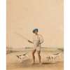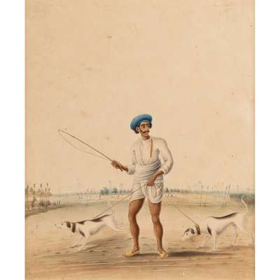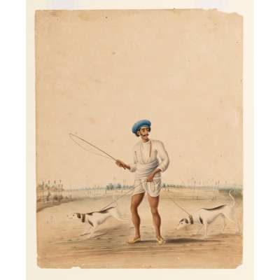 watercolour on paper, depicting a young servant in a blue turban with his two dogs on a lead, and holding a whip in his right hand, in a landscape [mp1]