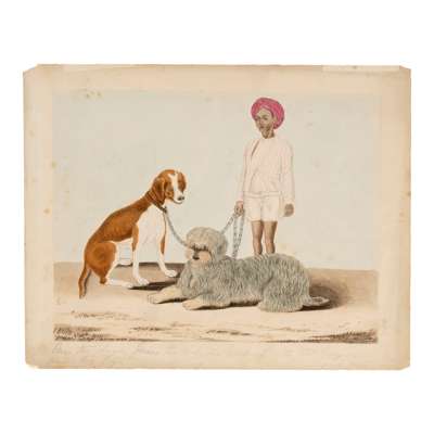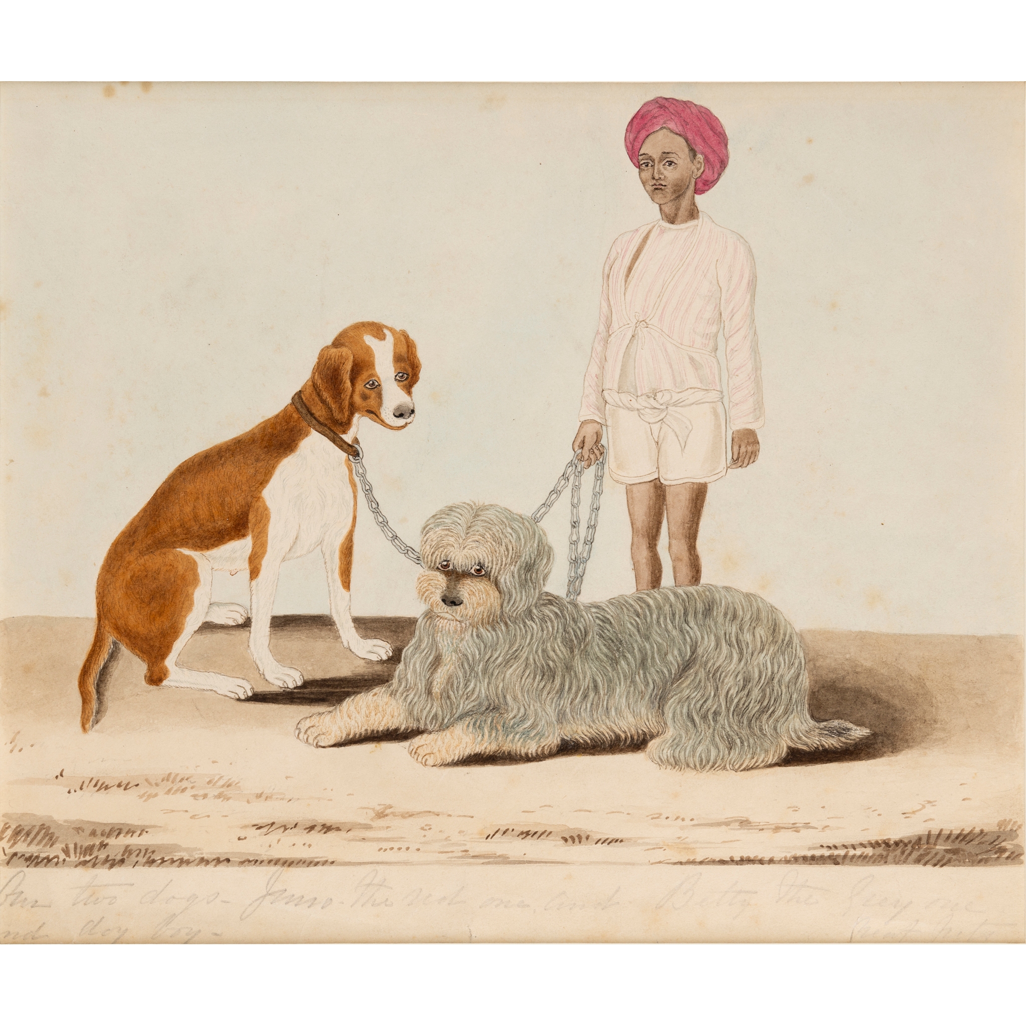 watercolour on paper, the servant in a red turban with his two dogs on a lead, no watermark, mounted, glazed and framed