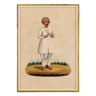 watercolour on paper, the servant is dressed in white and wearing a red and yellow turban, mounted