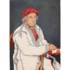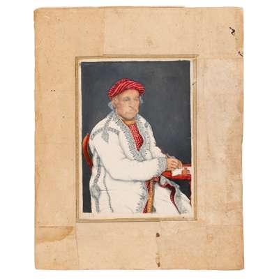 watercolour and pencil on card, depicting a man wearing a red turban sitting at his desk