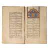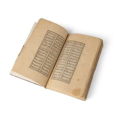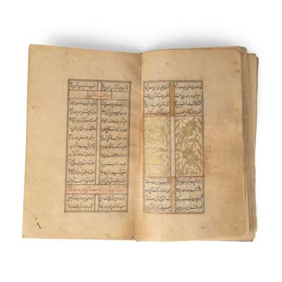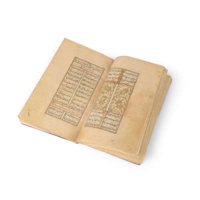 Ottoman Turkish manuscript on paper, 71 leaves, 15 lines to the page written in two columns of elegant nasta’liq script in black ink, double intercolumnar rules in gold, inner margins ruled in black and gold, one illuminated headpiece in colours and gold, headings written in natal’liq script in red ink, edges frayed, discoloration, some working restricted to outer and inner margins, later maroon morocco gilt binding, slightly worn, doublures of marbled paper