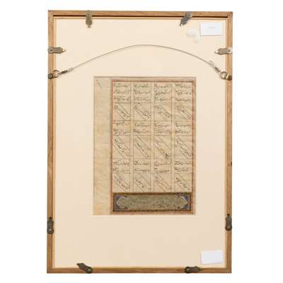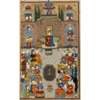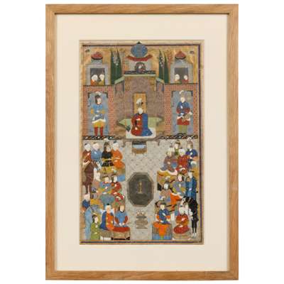 likely to be from a Safavid manuscript of Firdausi’s Shahnama, gouache on paper heightened in gold, depicting a ruler enthroned, flanked by huntsmen, foreground within a symmetrical courtyard with fountain, the court audience on either side, verso with inscriptions in nastaliq black ink, divided into diagonal lines and horizontal lines, heading in a coloured and gold panel