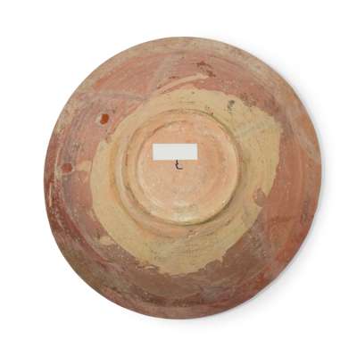 with flaring sides, painted under a transparent glaze in red, green and dark brown, with a wide band of repeat pseudo-kufic inscriptions, around an inner dotted circle, with dotted rim