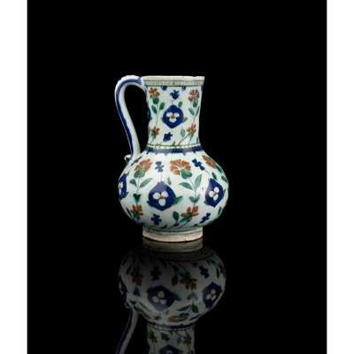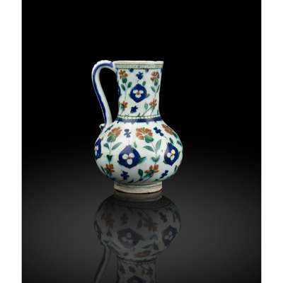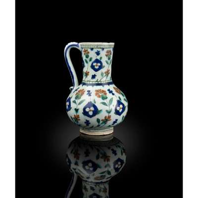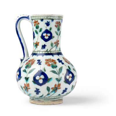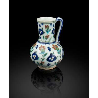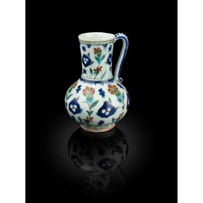 A STRIKING AND INTACT IZNIK POTTERY JUG DECORATED WITH CARNATIONS, POMEGRANATES & CINTEMANIS