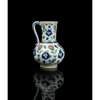 of baluster form on a short foot rising to a slightly flared mouth, with ‘S’-shaped handle, underglaze painting in cobalt-blue, bole red, green and black with stylised pomegranates containing white cintemani motifs, alternating with carnations, all reserved against a white ground, with a narrow band of wave-scrolls around the edge of the rim