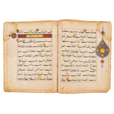 Arabic manuscript on paper, conjoined leaves, 11 lines to the page written in elegant black bihari script, sura headings in white on coloured illuminated panels with palmettes extending into the margins, the word Allah written in gold throughout, gold florets marking verse divisions, large blue and illuminated gold marginal drop-shaped device, margin rules in red and blue