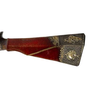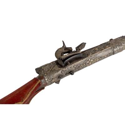 the barrel stamped with ‘Leievi’, with arch-shaped sighting plate, six silver barrel bands, stock covered with red velvet, stock and barrel extensively decorated with pierced and chased silver mounts decorated with ‘shams’ medallions, and comprising interlacing vine motifs, rosettes, palmettes and geometric designs