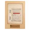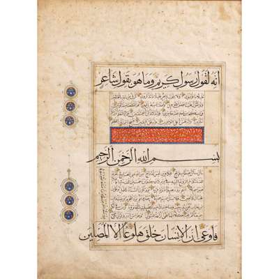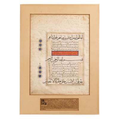 Ottoman Turkish manuscript on paper, with 10 lines to the page in elegant black nashki and 3 lines in large thuluth script with a sura heading in gold script on a red panel, gilt rosette markers, blue drop-shaped marginal devices, mounted with old description label