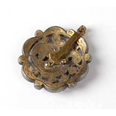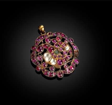 of circular form with small suspension hoop, the gold openwork frame set with rubies, emerald and Indian cut diamonds, forming a bird design to the centre, verso engraved