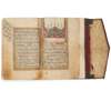 comprising a selection of suras starting with Ya Sin and ending with al-Qadr, interspersed with glosses in Turkish, al-asma' al-husna (the 99 names of Allah), etc., Arabic manuscript on cream and pink laid paper, approx. 70 folios, 11 lines to the page written in black naskh script, opening bifolium and al-asma' al-husna each with polychromatic floral headpiece, opening bifolium with text written within gold cloud-bands, text framed within concentric gold and red borders, sura-headings in red with polychromatic arabesque vignettes either side, recitation markings and key words and phrases in red, roundel verse-markings in gilt, contemporary gilt leather filigree binding with envelope flap, neatly rebacked with cloth, corrosion of paper from pigments used in decorative borders causing numerous text-panels to detach. Together with an unidentified Persian manuscript, probably poetry, copied in India, 19th century, and a cutting from a medieval manuscript in Latin, possibly 13th century, 7.5 x 16cm, in a rounded bookhand, paraphs in red and blue, ruled in plummet