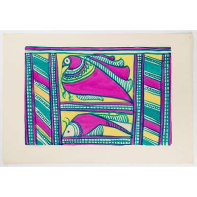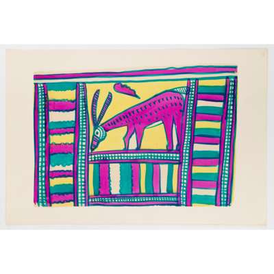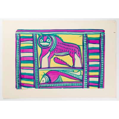 Lots 98 to 104 are a collection of brightly painted caskets and lanterns that are a form of Indian art produced by the Mali caste. The Archers collected these between 1937 and 1938, when Bill was posted to Purnea. These were mainly for use during the festival of the snake goddess, Bishahari. Sections of these were executed on rice paper, primarily in bright yellow, magenta and green, and mounted on to lightweight bamboo sticks. Mildred writes, ‘All were brusquely simplified and it was impossible to ignore their Picasso-like affinities.’