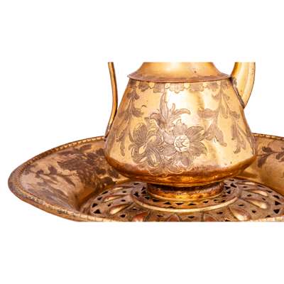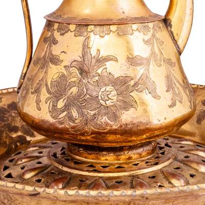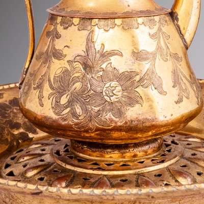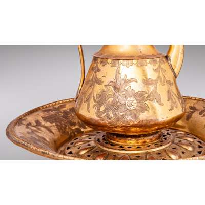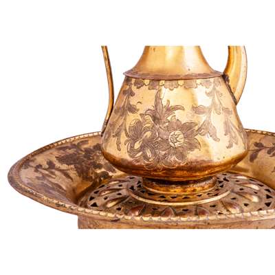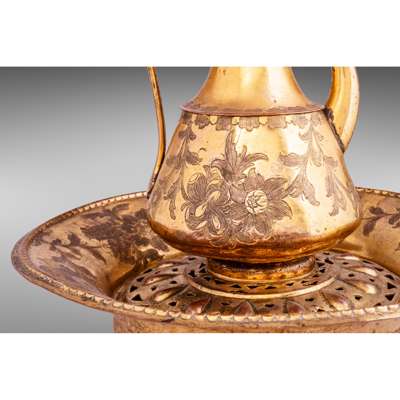 Ewers and basins were used at ceremonial events and gatherings for the washing of hands and ablution - an important custom in Muslim daily prayers. The present ewer and basin is a very fine example of tombak-ware from the 18th century on account of its almost pristine layer of gilt. It is richly decorated in the rococo-style which became very popular in the 18th century.