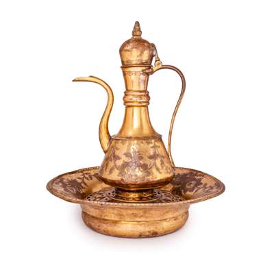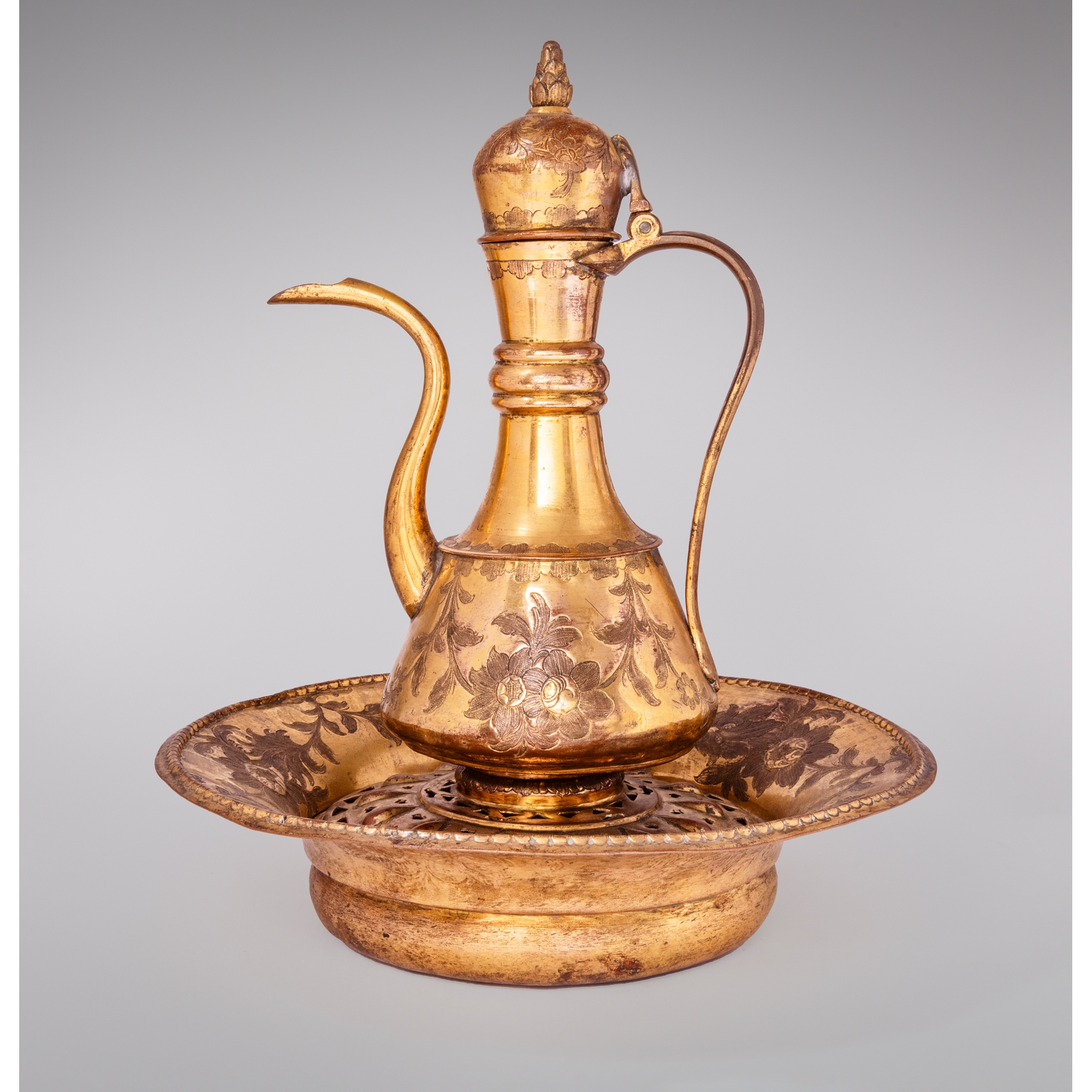 A FINE OTTOMAN GILT-COPPER (TOMBAK) EWER AND BASIN