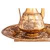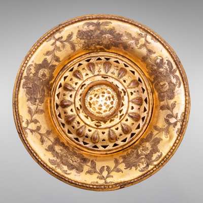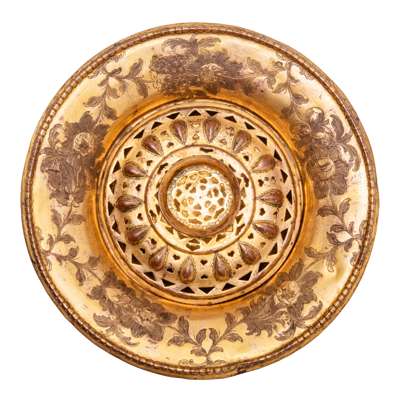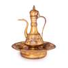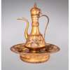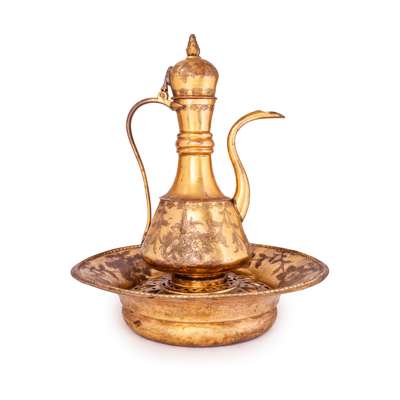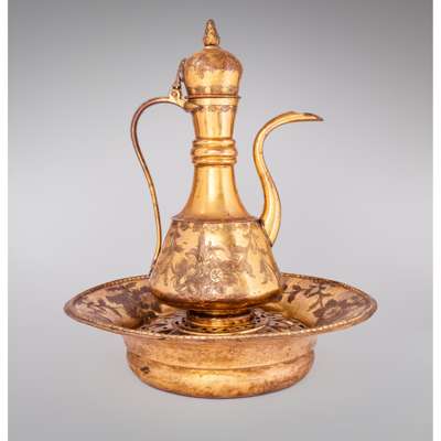 Tombak is a term used to describe a copper alloy that is mercury gilded to imitate the appearance of gold - a term that has become synonymous with crafts of the Ottoman Empire. According to the teachings (Hadith) of the Prophet Mohammad, the use of gold in daily objects represented extravagance and wastefulness. It is for this reason that tombak-ware was prized as an alternative to gold. The earliest examples date to the 16th century and tend to be confined to the Ottoman Imperial court arms and armour and important religious vessels such as mosque candlesticks and mataras. The 17th and 18th centuries saw an emergence of more domestic vessels, such as this superb ewer and basin.