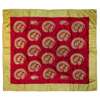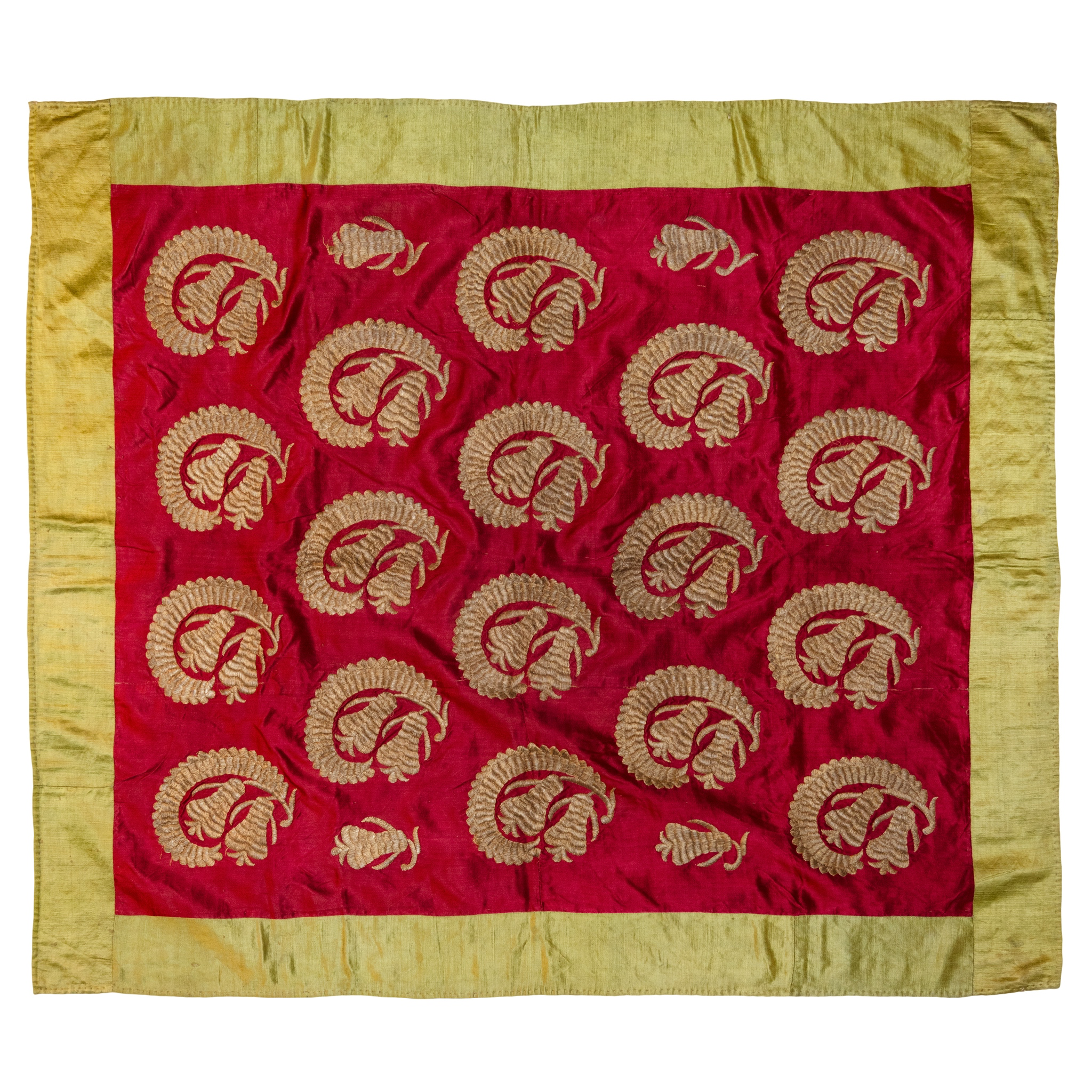 square, the silk burgundy ground embroidered with silk and metal-thread, with an allover repeat design of double pears, backed