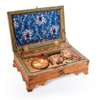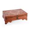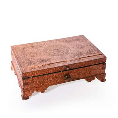 the rectangular carved wood box on four square feet enclosing a lacquered wood tray with various compartments containing a row of varying weights at the top, two different-sized scales with their suspending steel poles, and a pair of tweezers, the exterior box carved in low relief with floral and bird decoration