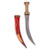 with curving and tapering double-edged watered steel blade with central ridge, the forte decorated with a lion attacking a stag amidst birds and foliage, the hilt decorated with vertical, pointed and cusped cartouches containing inscriptions, the top of the pommel with further inscriptions, with associated sheath