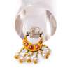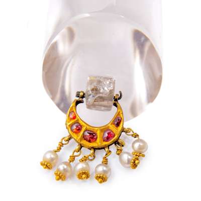 with straight watered steel tapering blade with reinforced sharp edge and flattened spine, carved rock crystal hilt with a gold and ruby-set crescent shaped finial suspended from it, the associated velvet covered scabbard with gilt metal chape and finial