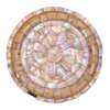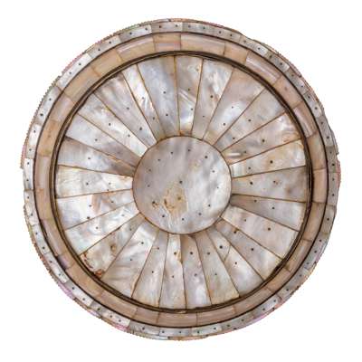 of shallow rounded form with a narrow flat rim on a short brass foot ring, composed of geometric mother-of-pearl sections forming a flowerhead within a central roundel with an outer band of radiating panels, all sections secured by pins, jagged rim edge, verso with central circular panel and radiating panels, brass band below rim