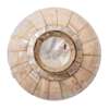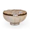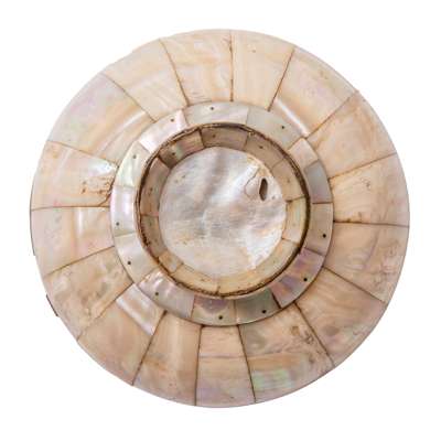 of rounded form on a slightly flaring short foot, composed of geometric mother-of-pearl pinned sections forming radiating panels issuing from a circular central panel, semi-covered brass ring band around the rim, covered brass foot ring
