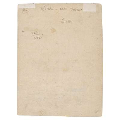 gouache heightened in gold on paper, red border, inscription in devenagari in upper margin, depicting a maiden stringing garlands, seated in a landscape facing left under a tree in blossom, a female attendant preparing a bed-chamber under a canopy to the right, a peacock on the roof, old inscriptions in pencil on the reverse, mounted, framed and glazed [mp1]