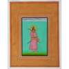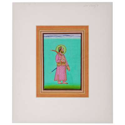 gouache on paper heightened in gold, brown border with white and pink rules, depicting the ruler standing facing to the right, formally dressed in a pink jama secured with a gold patka, in which sits a sword and a ram-hilted dagger, he holds a bejewelled tulwar over his right shoulder, wears a bejewelled cap and his face is wrapped in a green nimbus, green landscape behind, mounted, glazed and framed