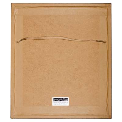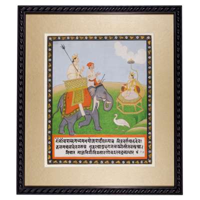 gouache on paper, panel at bottom with three lines of nagari text in thick black ink, floral border, mounted, glazed and framed