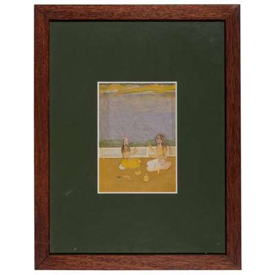 gouache on paper heightened in gold, depicting two ladies eating and drinking together on a terrace, trays of sweet meats and a pouring vessel in the foreground, landscape behind