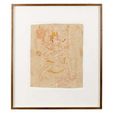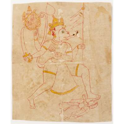 gouache and ink on paper, depicting the large monkey-like Hanuman in an excited trance with his foot over Parvati, trampling her, mounted, glazed and framed