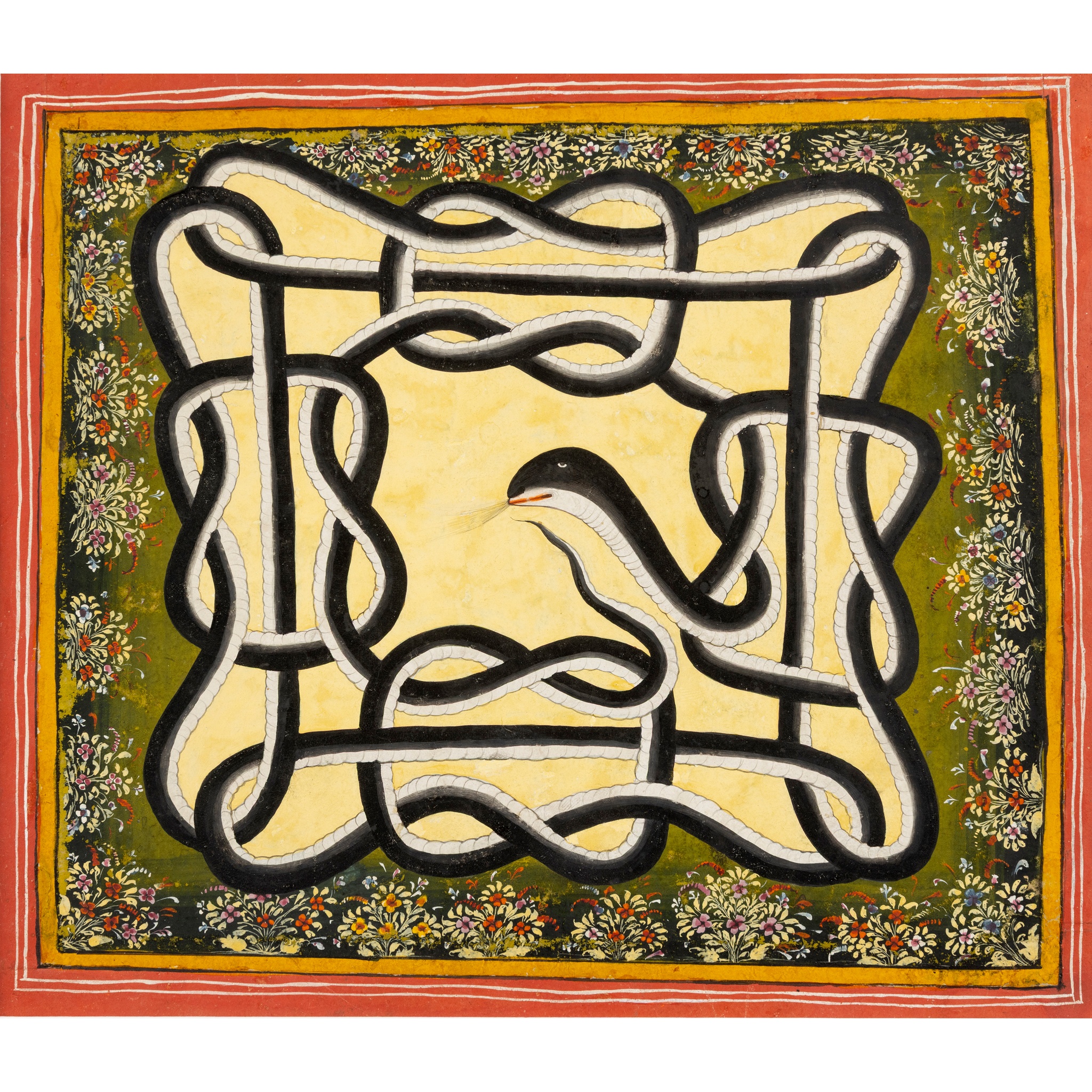 This Mewari artist quickly captures the eye of the onlooker with the hissing and coils of a serpent in this unusual Indian painting, inscribed on reverse in nagari 'naag paash' meaning serpent-noose. Vishvajit, also derived from 'naag paash', was the name given to the lasso used by Varuna, an important Vedic deityj. This deadly weapon was again used by Ravana, one of the demons in the Ramayana, when he tried to ensnare Rama and Lakshmana. Garuda, the god and king of birds and enemy of snakes, swiftly comes to the rescue by loosening the naag paash and releasing Ravana's deadly grip. For further discussion, see A.Sattar, The Ramayana by Valmiki, New York, 1996, and A. Dalapiccola, Dictionary of Hindu Lore and Legend, London, 2002.