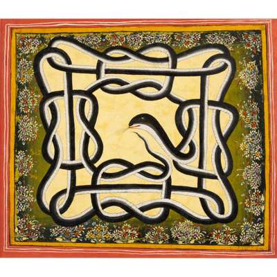 gouache on paper, an intricate mesh is formed by the coils of a very long snake that loops in on itself to tighten a complex series of reef knots and corner loops, the venomous head with hissing tongue and the darting tail of the snake meeting at the centre of the picture where the snake both begins and ends