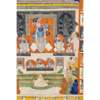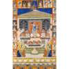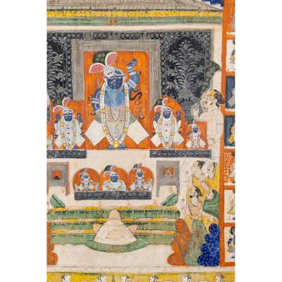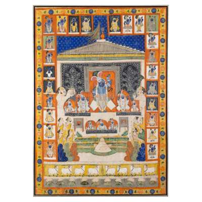 This vibrant and richly coloured pichhavai is an excellent example of the Nathdwara school of painting. It portrays the sanctum of the Shri Nathji temple in Nathdwara during the festival of Annakuta, celebrated annually in October and November. The festival commemorates the villagers of Vraj offering their harvest to Mount Govardhan, following Krishna's guidance. As the most significant festival of the year, Annakuta draws pilgrims who bring the fruits of their harvest to the temple. A symbolic mountain of rice is placed at Shrinathji’s feet, surrounded by offerings in bowls. Women in brightly hued veils are shown kneeling reverently on either side of the deity. Vallabhacharya, the founder of the Pushtimarg sect, is depicted standing to the left, while smaller cartouches around the composition feature other forms of the god.