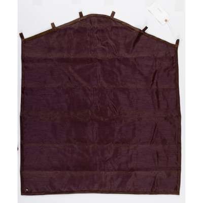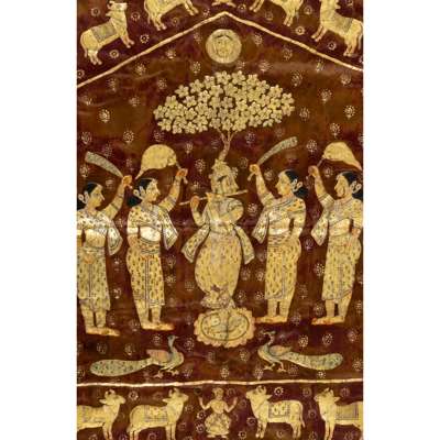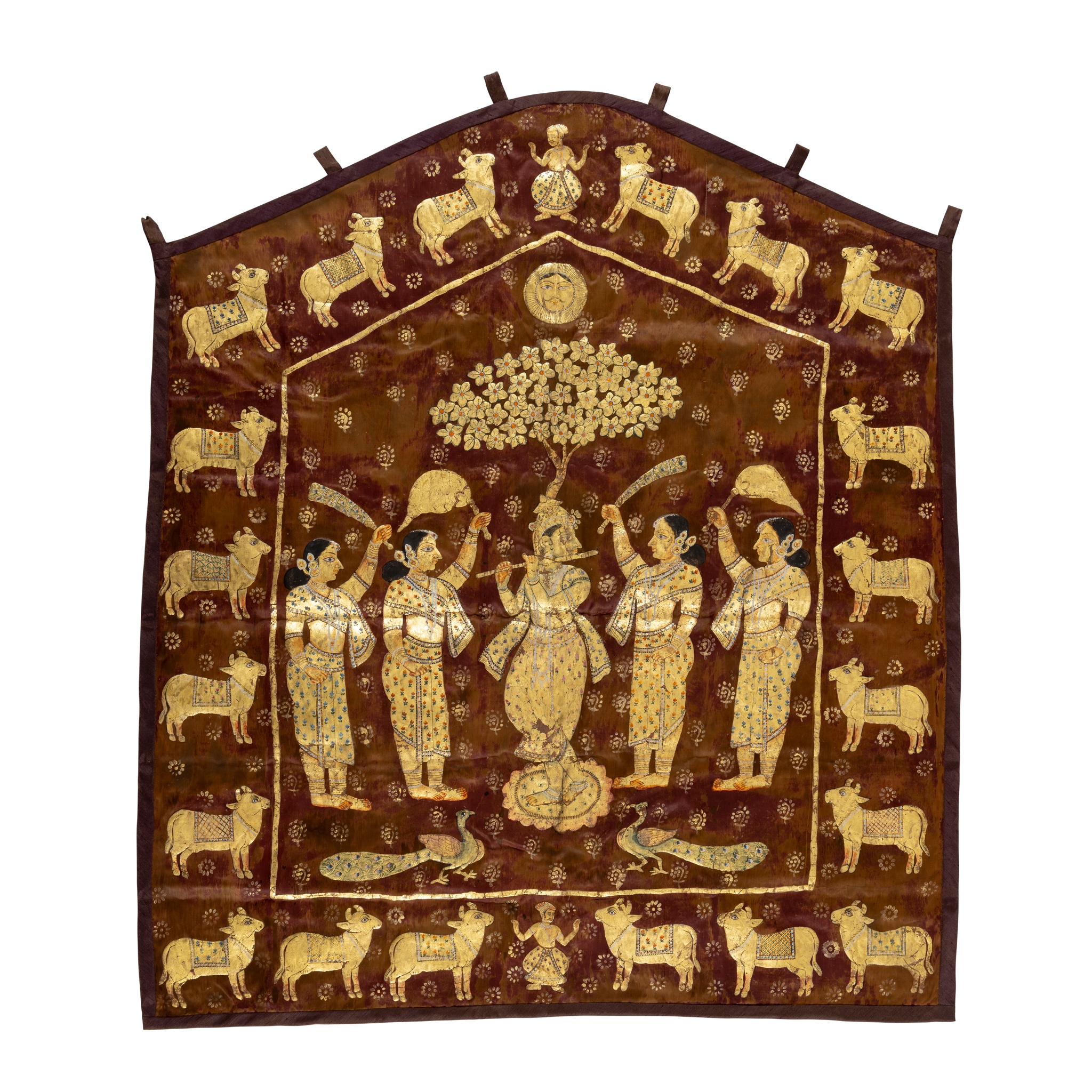 of pointed-arch form, the brown satin ground painted in gold leaf depicting Krishna in the centre playing the flute, flanked by pairs of gopis holding fans, the border with a repeat design of nandi, backed, hoops on the upper edge