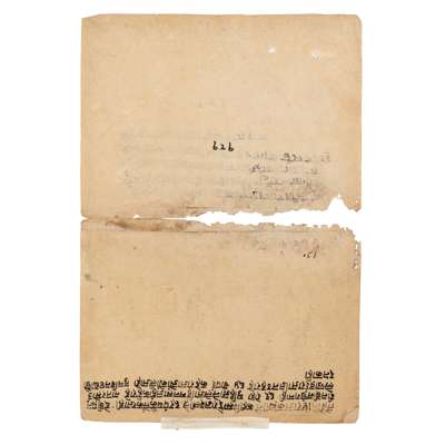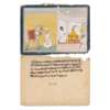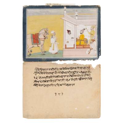 gouache on paper, dark blue border, cover paper with five lines in gurumukhi text and the number ‘181’, depicting King Bhima, the father of Damayanti, receiving King Rituparna of Ayodha presenting two charioteers with their two stallions, courtiers kneeling at the side of the ruler, an attendant standing in the background waving a cauri