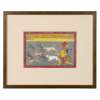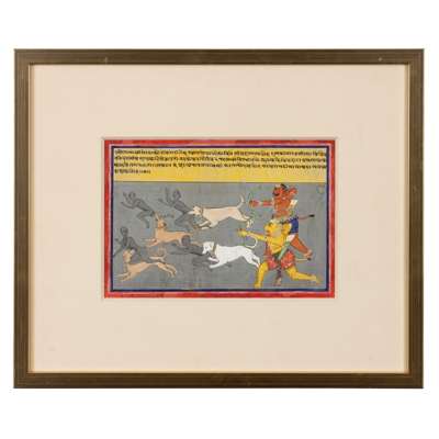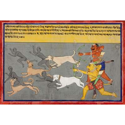 gouache on paper, red border with blue margin rules, four lines of nagari text above in a yellow panel, from the right a yellow and orange demon running forward with bows and arrows, four hunting dogs ahead of them chasing and catching ghost-like figures, mounted, glazed and framed