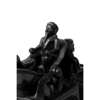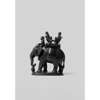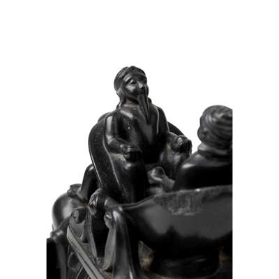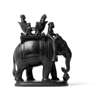 black stone carved with naturalistic details on a stand, the elephant caparisoned with a ceremonial howdah with two people seated inside facing one another, one figure with a characteristic long and tapering beard with his hands out in prayer closely resembling Ranjit Singh, a mahout is seated on the elephant's neck