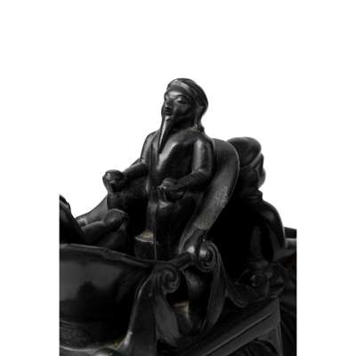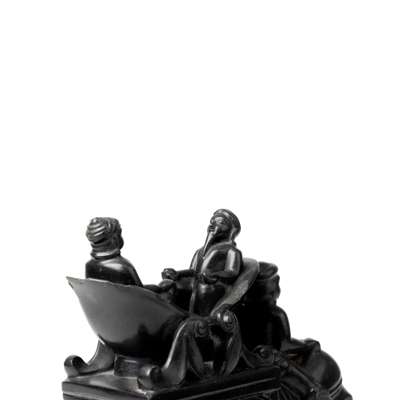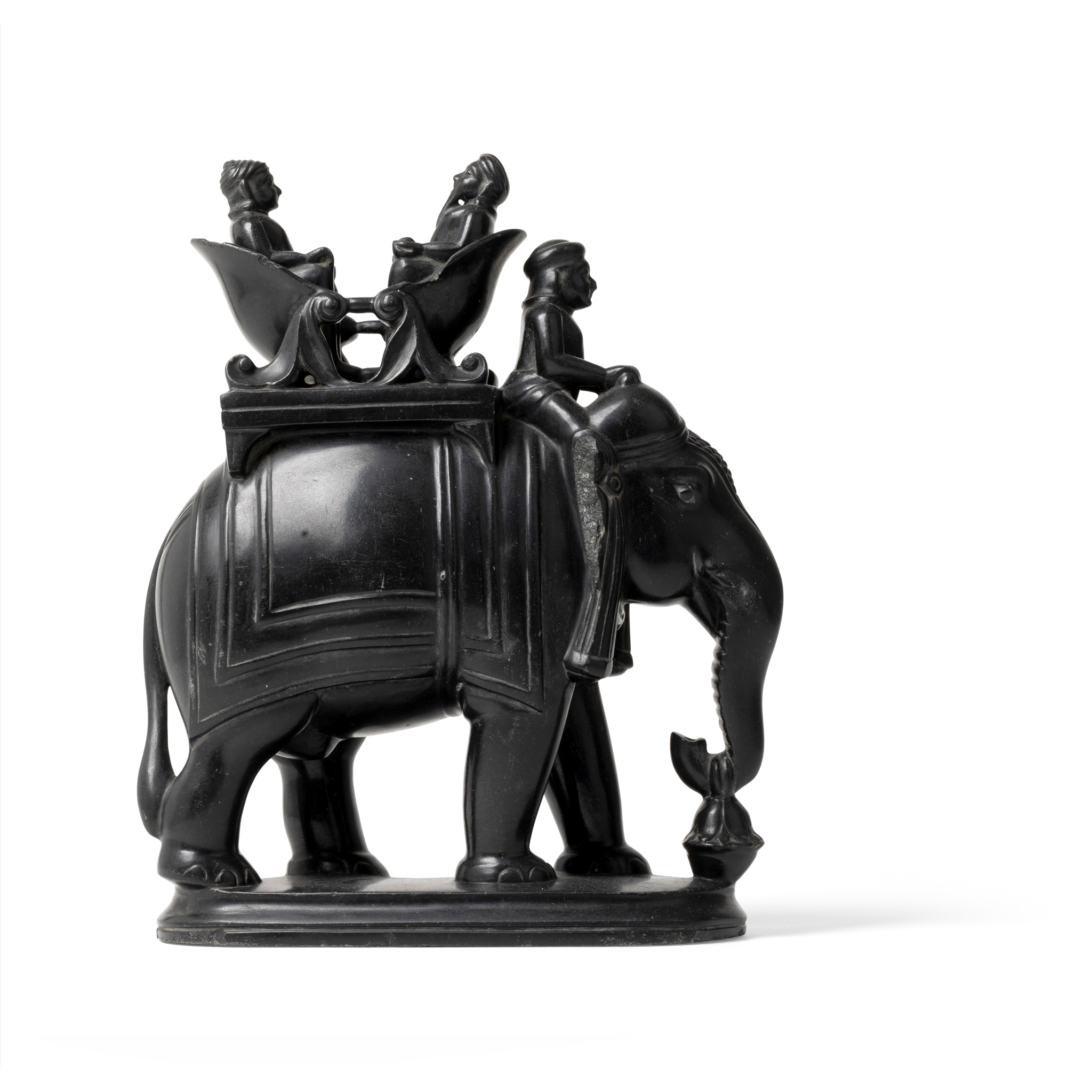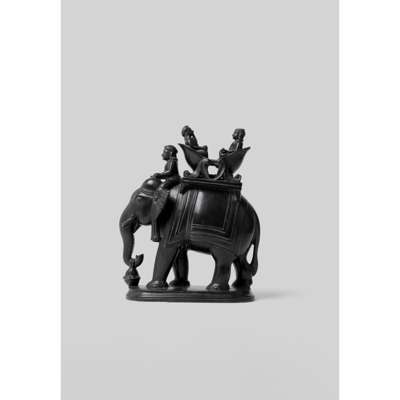 Elephants have long been used in India to carry rulers during official processions and hunts and therefore are a common motif in art and sculpture depicting sovereigns. Their attributes were a marriage of Indian and European sensibilities, often exposed to Britain during the Regency period. Our example very likely depicts Maharajah Ranjit Singh with his distinctive howdah and facial resemblance. For a small carved black steatite sculpture of Ranjit Singh, See Bonhams, Islamic and Indian Art, 30th April 2019, Lot 205.
