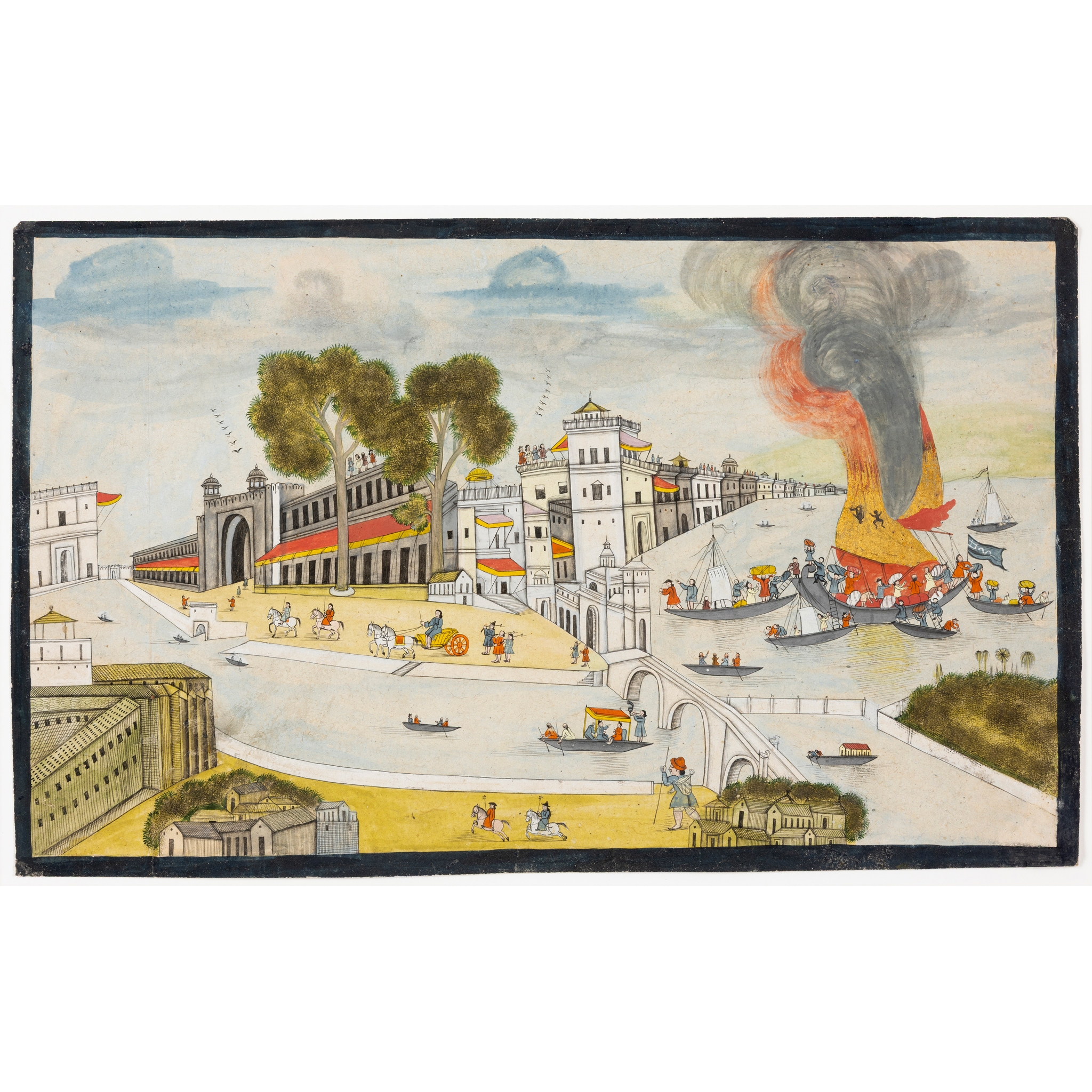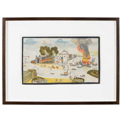 gouache on paper, with a dark blue border, depicting a city harbour scene where a drama has unfolded in the form of a merchant ship taking fire on the right hand side, whilst people are depicted steadily emptying the ship, two charred bodies are seen rising up through the flames, other boats nearby are assisting, to the left the rest of the city goes on living with the gentry out on horseback or in a horse drawn carriage, riders on horseback, the backdrop of the city with a row of red and yellow awning flanking the city entrance, rows of figures on some of the buildings no doubt looking at the drama unfold