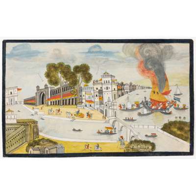 This lot and the following lot have a distinctive charm about them. Within the first painting, whilst the artist has successfully recounted a dramatic event with all the movement, gathering of people and the engulfing flames, they have failed to master perspective. The sea on the right hand side appears to be higher than the whole city and the two horse riders in the foreground are minuscule, compared to the rather large and obscure figure on the right in the foreground carrying a stick. Similarly in the second painting, the artist has managed the overall architectural perspective but then does not quite master the size of the figures. Both these paintings are charming interpretations or pastiche of Western prints. For further discussion on these types of paintings produced by local Indian artists, see B.N. Goswamy and Anna Dallapiccola, A Place Apart: Painting in Kutch, Oxford University Press, 1983.