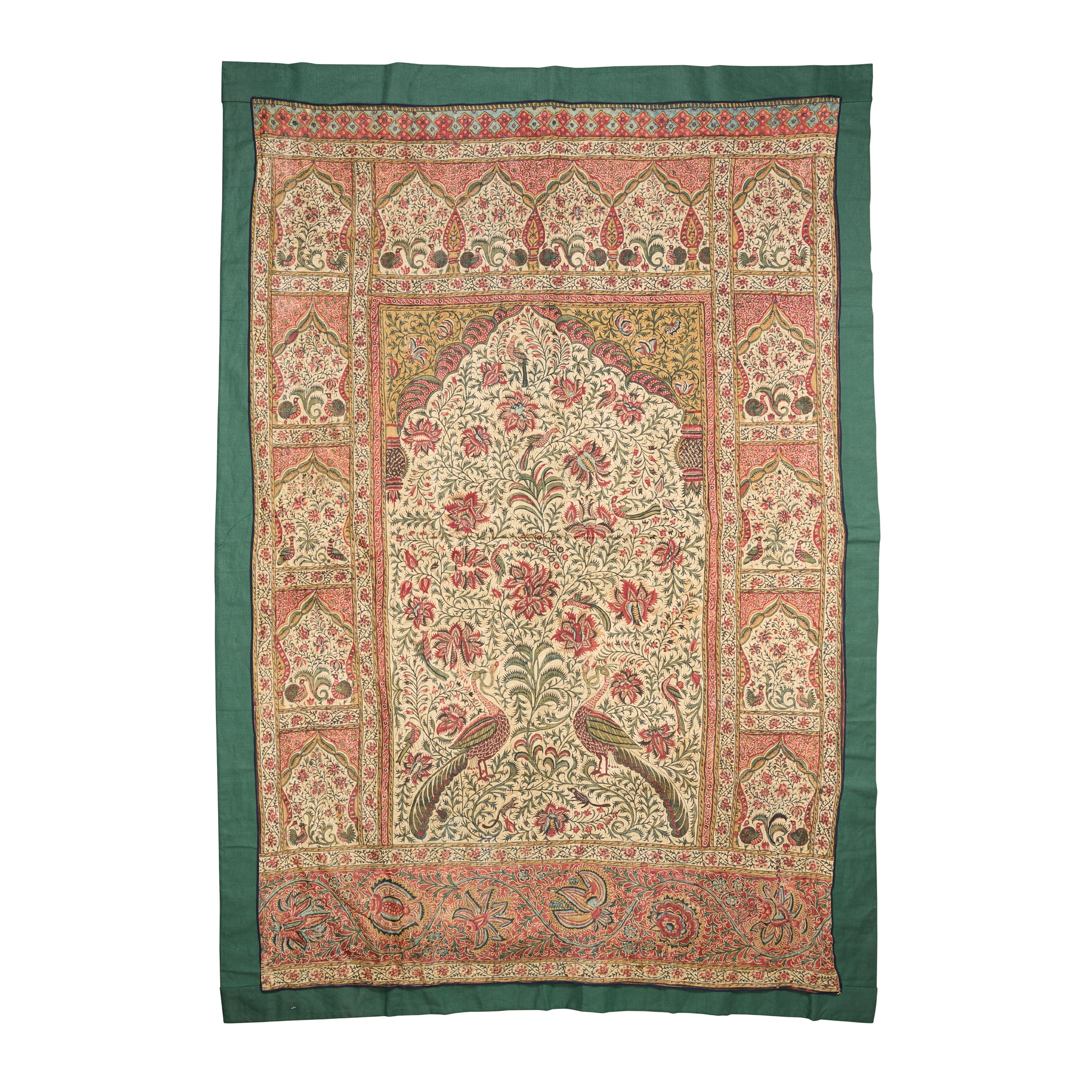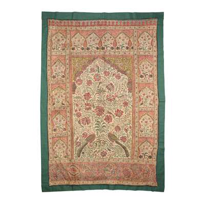 the rectangular cream cotton ground, painted with a mihrab arch with a pair of peacocks at the bottom and a ground of floral motifs, with a band of repeat smaller arches with pairs of birds and floral motifs around the arch, the lower part with a wide band of meandering floral palmettes, backed