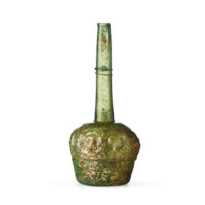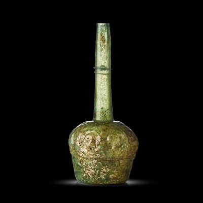 AN ISLAMIC MOULDED BLUE GLASS BOTTLE