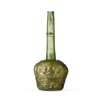 of globular body in blue transparent glass, moulded with floral scrolls, tall slender neck with applied wavy bands, remains of iridescence on the surface