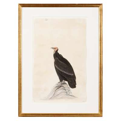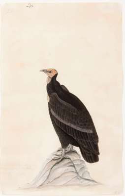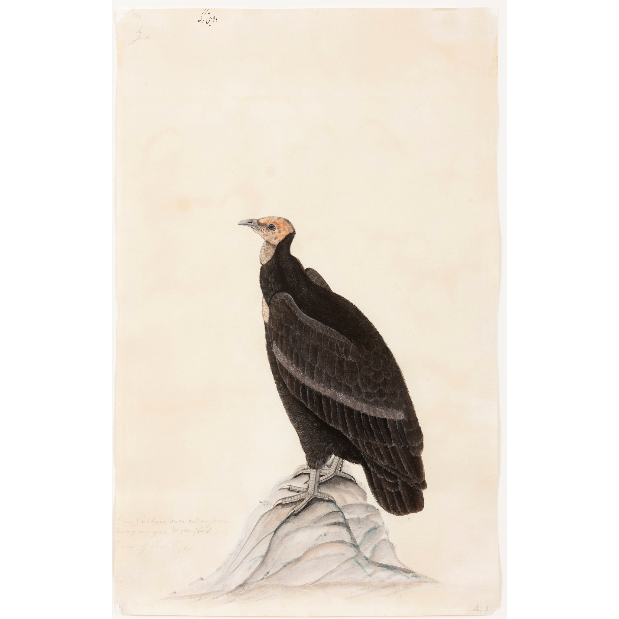 The vulture pictured here is something of an enigma. The large wings with relatively short primary flight feathers which do not extend beyond the tip of the tail, and its relatively long hind toe suggests that it should be an Old-World vulture. The fact that it is the subject of an Indian painting one would expect it to be an Asian species. But it is not. The closest Old-World species is the African Hooded Vulture Necrosyrtes monachus, but their “hood” consists of pale brown down and not black feathers. The black colouration and red head are reminiscent of an American Turkey Vulture or another of the genus Cathartes, but the nostril shape and wing markings do not fit these either. The bill is unhooked, the fleshy cere on the bill is behind, and not surrounding the nostril, and, although the head is coloured red, it gives every indication of being covered in feathers which surround the bill and eye and completely mask the ear opening. Neither are there any slender-billed vulture species with anything resembling a wing bar, though it is possible that this marking is intended to represent a line of shiny iridescence. This is a bird which does not exist, possibly painted from a description or recollection of a vulture once seen. It is an amalgamation of different species, possibly inspired by famous paintings of vultures, such as those of the Mughal artist Mansur in the celebrated Kevorkian Album. It was not drawn from direct observation of a vulture but is, nevertheless, a beautiful and interesting painting.