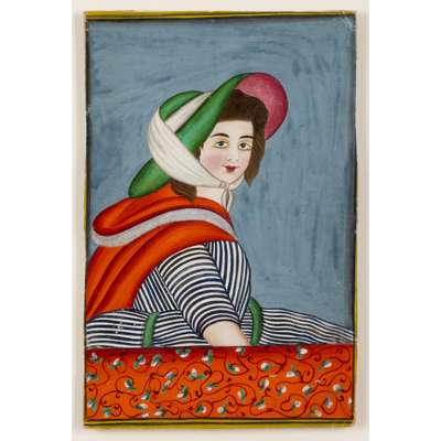 gouache on paper, depicting a half portrait of a young European lady behind red window sill, she is dressed in a striped blue and white dress, a red cloak and a green bonnet, mounted, glazed and framed