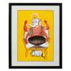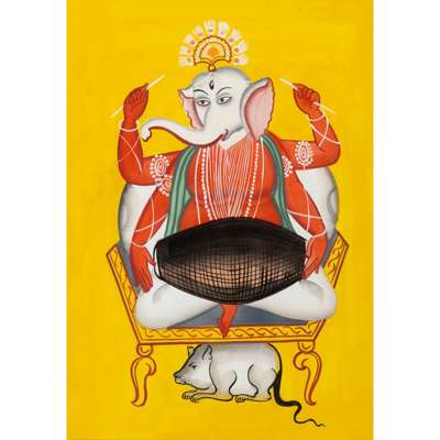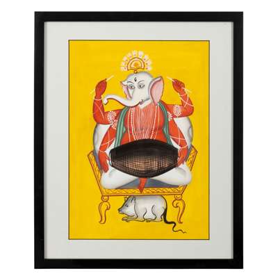 watercolour on paper, on a bright yellow ground depicting Ganesha seated cross-legged playing the drums on a chair above his vehicle mouse, mounted, glazed and framed