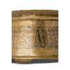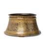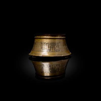 of truncated conical form with flaring foot, a raised rib below the upper edge, engraved and decorated in silver and remains of polychrome enamel inlay, the body with inscriptions in thuluth script interspersed by roundels containing floral motifs, all on a ground of scrolling tendrils, inscribed in two areas outside the main decoration