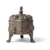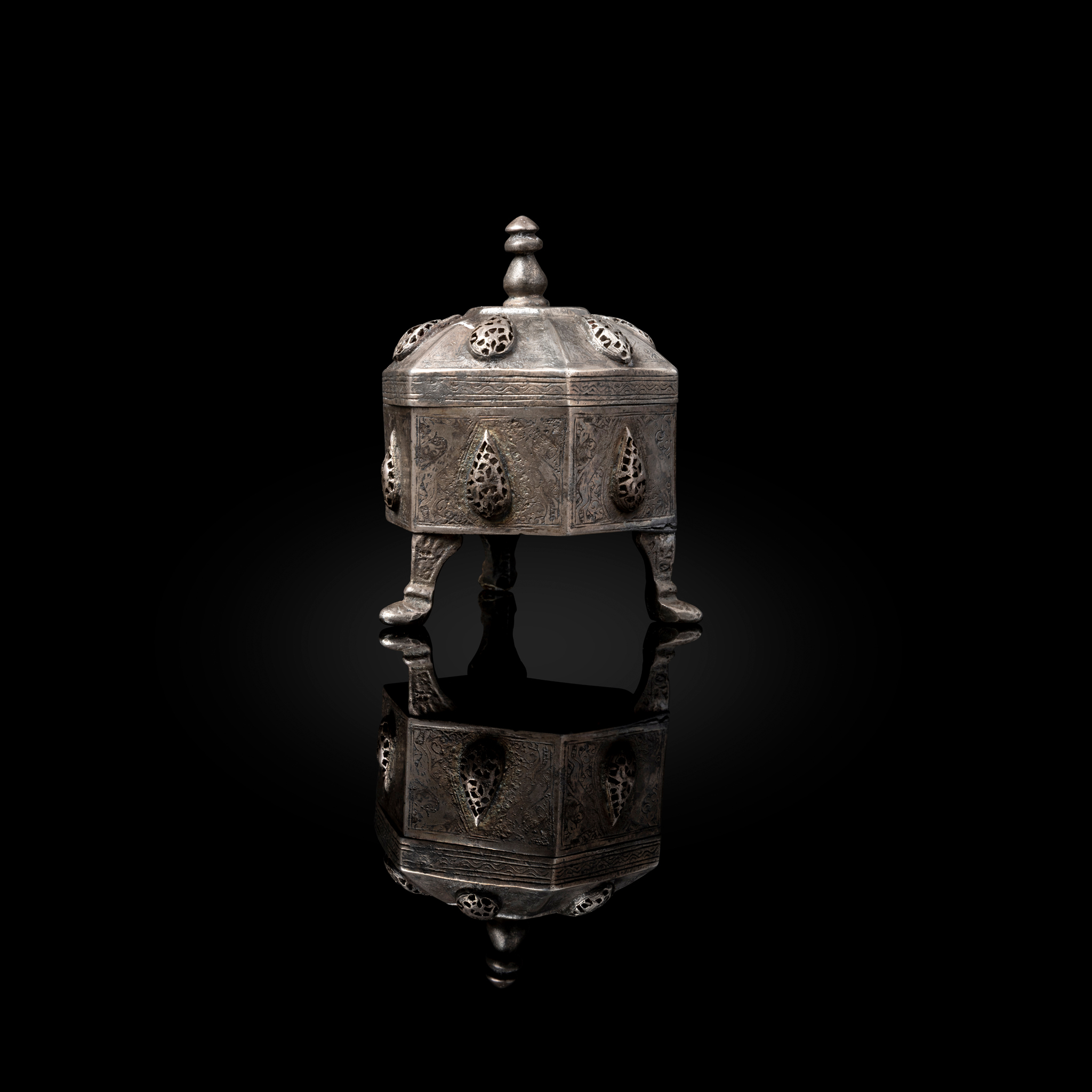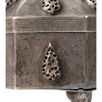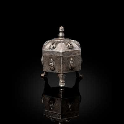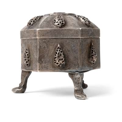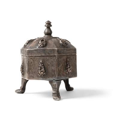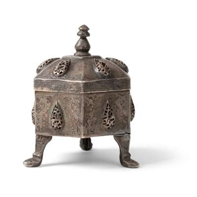 of hexagonal form on three anthropomorphic feet, with teardrop-shaped openwork bosses on each side and each facet of the lid, against a scrolling vegetal design, the bosses flanked by rearing deer