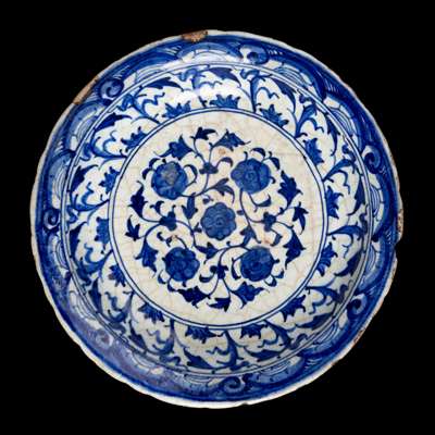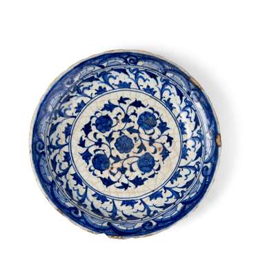Like their Mongol ancestors before them, the Timurid rulers of Iran and Central Asia enjoyed strong cultural links with China. Such a connection is clearly visible through their taste for locally-produced blue and white ceramics such as this dish. It forms part of a larger group of which the decoration and form were inspired by 15th century Chinese Ming originals. Although there were a number of production sites in both the east and west of their empire, Tabriz is known to have produced the most aesthetically and technically impressive examples (see J. Soustiel, La céramique islamique, Office du Livre: 1985, p. 216). The cusped rim and wave pattern on the rim can be seen on an early 16th century dish in the British Museum (1965,0729.1), and the foliage on the cavetto is very closely paralleled by that on a dish in the Ashmolean Museum (EA1978.1740) (see L. Golombek, Mason, R.B., and Bailey, G.A., Tamerlane’s Tableware: A New Approach to Chinoiserie Ceramics of Fifteenth- and Sixteenth-Century Iran, Mazda Publishers in Association with Royal Ontario Museum: 1996, pp. 152, 154). A dish with a near-identical main design of five roses was sold at Sotheby’s, Arts of the Islamic World & India, 25 October 2023, lot 139.